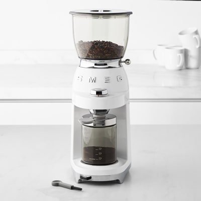 نام زیبای SMEG با رنگ نقرهای امضای زیبایی از این کمپانی ایتالیایی بوده که در قسمت جلوی دستگاه درج شده است. درجه تنظیمات این آسیاب قهوه در قسمت جلو بالاتر از مخزن پودر قهوه تعبیه شده است. این آسیاب قابل جابجایی امکان تمیز کردن راحت و دقیق را فراهم میکند. سیستم ایمنی نیز در صورت برداشته شدن دستگاه از خطرات احتمالی جلوگیری میکند. بدنه این آسیاب به رنگو قسمتهایی نقرهای بوده که زیبایی آن را دو چندان کرده است. این آسیاب مجهز به 2 مخزن مجزا برای دانه قهوه و پودر قهوه بوده که شفاف میباشند و محتویات داخل آن قابل مشاهده است.